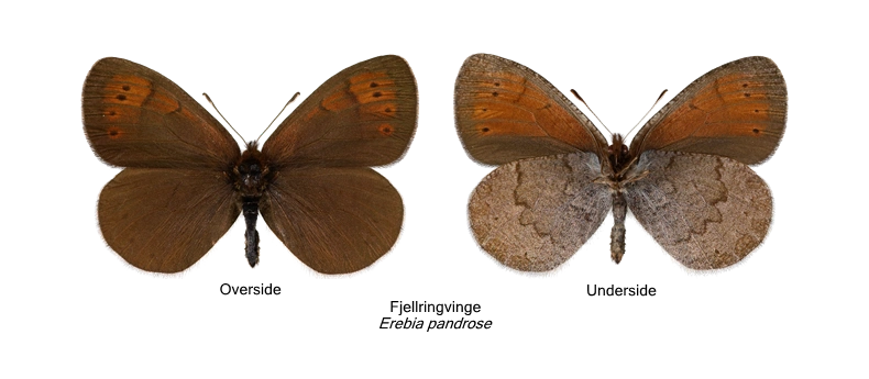 Vingeoversiden er gråbrun. Framvingen har et bredt brunrødt felt ved vingespissen som omslutter 2-4 øyeflekker uten kjerne. Feltet er tydelig avgrenset av et mørkt tverrbånd innad, men det finnes ofte svakere brunrøde flekker innenfor tverrbåndet langs framkanten av vingen. Bakvingens overside kan ha øyeflekker uten kjerne, noen ganger med smal rødlig ring rundt. Framvingens underside har et stort brunrødt midtfelt. Bakvingeundersiden er gråmelert med ett eller to smale uregelmessige tverrbånd. Arten kan lettest forveksles med disas ringvinge, men kan skilles fra denne på det mørke tverrbåndet på framvingens overside, og på den rødbrune fargen på framvingens underside.