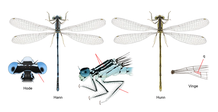 Arten er lett å kjenne på leggenes utseende. Andre sikre kjennetegn er de doble skulderlinjene, som synes godt i felt, og vingens q-felt, som er tilnærmet rektangulært (tilspisset hos andre smalvingede vannymfer).