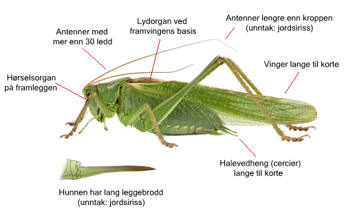 Underordenen løvgresshopper og sirisser (Ensifera) kan skilles fra øvrige norske rettvingearter (underordenen Caelifera) på følgende trekk: