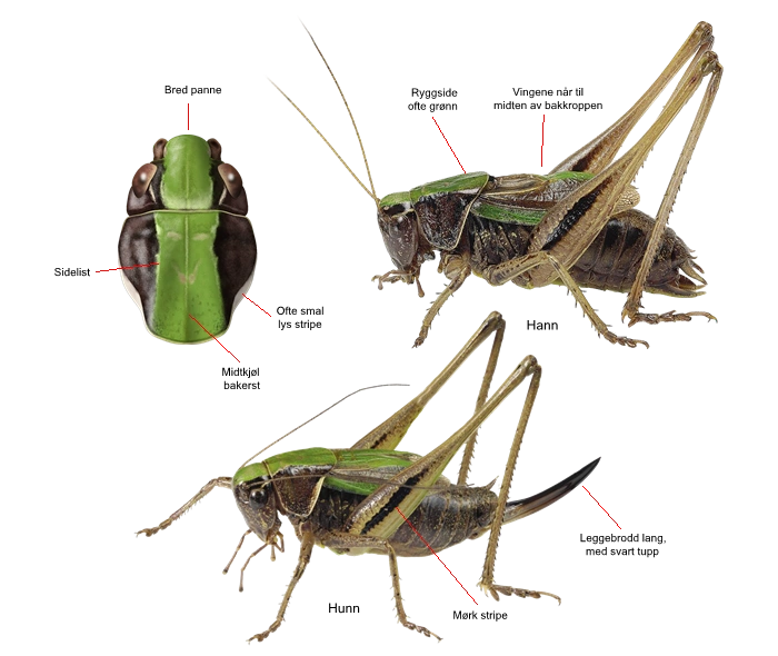 Arten ligner i størrelse og kroppsbygning på Metrioptera roeselii, men denne har bred lys sidekant langs hele siden av ryggskjoldet, lyse sideflekker framst på bakkroppen og en kamlignende svart tegning på baklåret. Helt brune individer kan forveksles med buskhopper, men denne har mye kortere (hos hunnen nesten fraværende) vinger. Andre potensielle forvekslingsarter har lengre vinger og/eller andre fargetegninger. Nymfene ligner særlig nymfene til buskhopper, som også er mørke med lys rygg, men eldre nymfer kan skilles fra denne ved at i det minste baklårene har grønne tegninger.