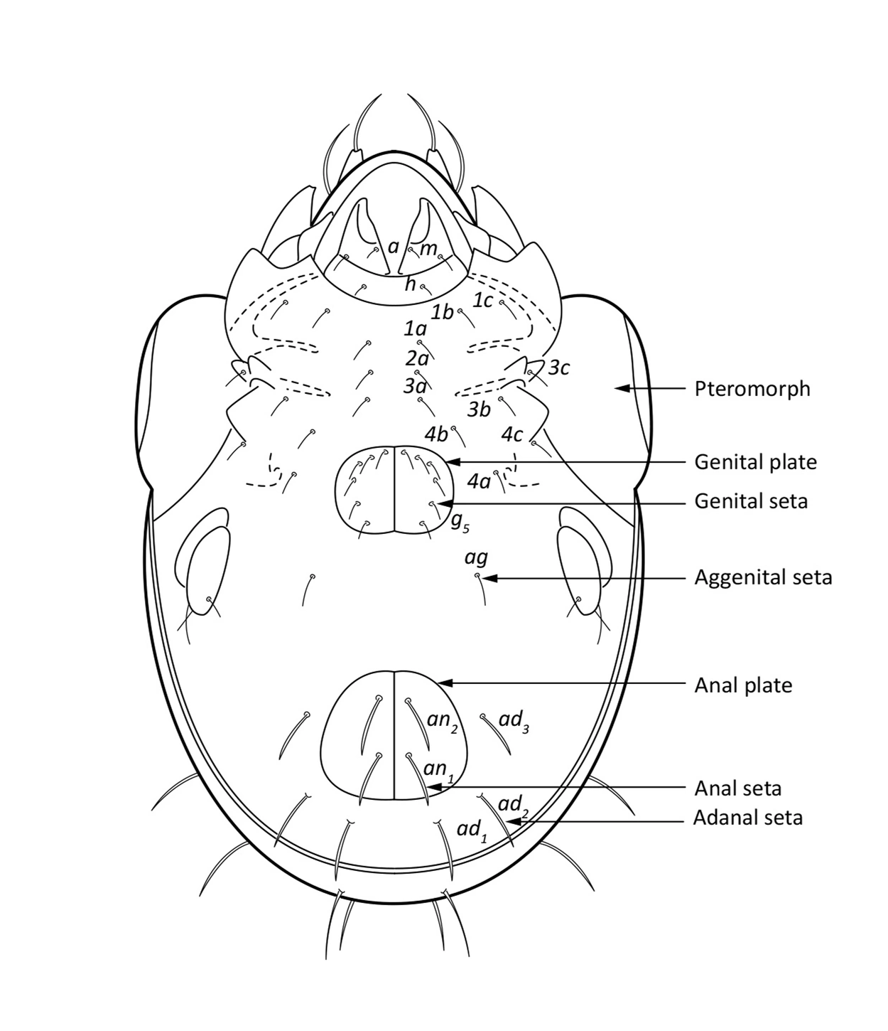 An adult has in the ventral aspect (seen from underneath) a genital and an anal plate, and sometimes also an aggenital and an adanal plate. In some families aggenital and adanal plates form one plate, called a ventral plate. The setae present on these plates are called genital, anal, aggenital and adanal setae (Fig. 12).