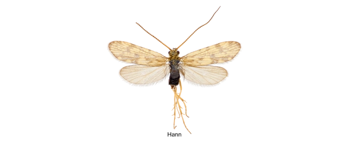 Familien kan kjennes igjen på det trådaktige filamentet på hver side av det femte bukleddet. Slekten kan skilles fra øvrige slekter i familien på kombinasjonen av gafler i fram- og bakvingen (1, 2, 3, 4, 5 + 2, 5). Arten kan lett forveksles med andre arter i slekten. Sikker bestemmelse krever at man undersøker genitaliene.